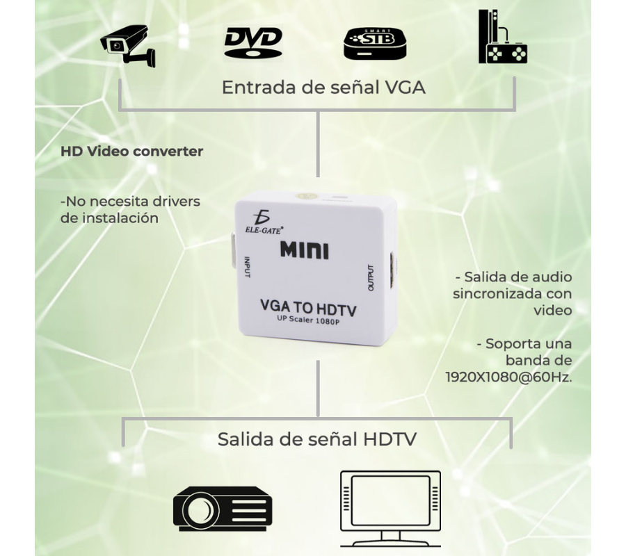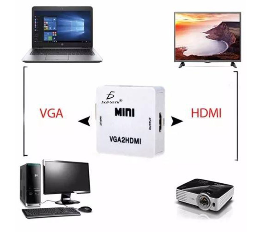 Con este útil convertidor podrás conectar cualquier PC, Laptop, DVD con salida VGA A Televisiones (LCD, LED), Pantallas o Proyectores con interfaz de video y audio HDMI (con soporte hasta 1920 x 1200).