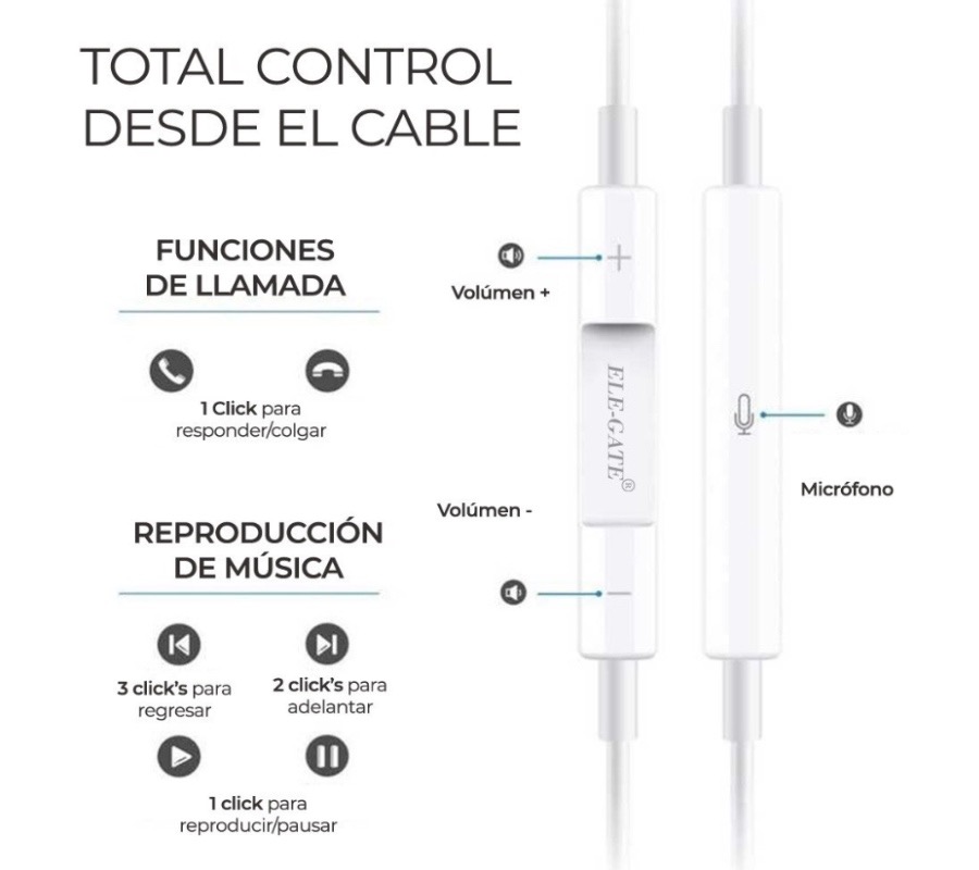 Cuenta con una botonera de 3 botones para responder llamadas, pausar la reproducción de música cambiar y retrasar, subir y bajar el volúmen del audio.