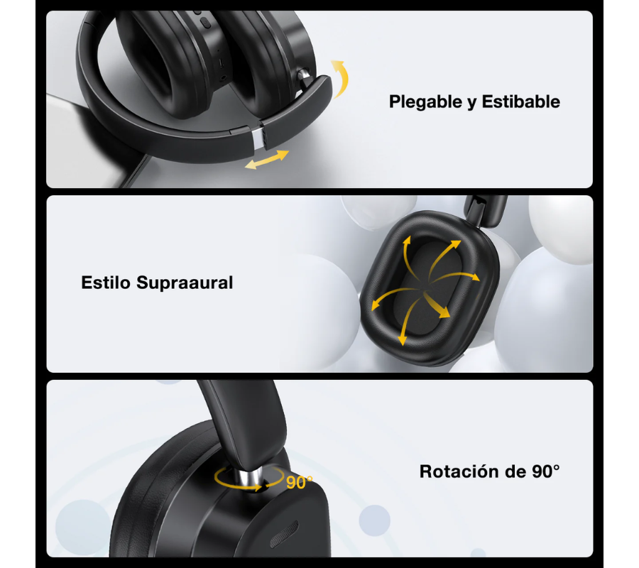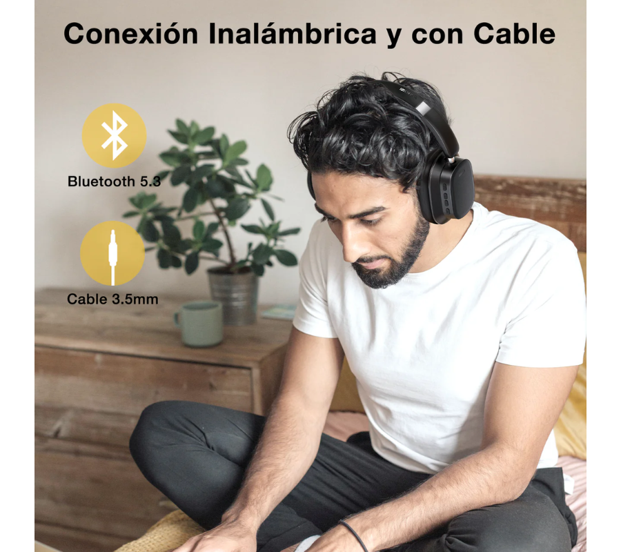 Además, puedes cambiar fácilmente al modo con cable utilizando el cable de audio de 3.5 mm incluido, eliminando las preocupaciones sobre el agotamiento de la batería y asegurando un disfrute musical ininterrumpido.