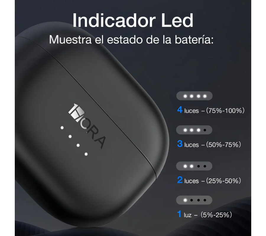 Visualización inteligente de la batería, control total en todo momento Cuatro luces de indicación de batería proporcionan una retroalimentación precisa sobre el estado de la carga, permitiéndote saber siempre cuánta batería queda. Evita sorpresas de apagón inesperadas y disfruta de música ininterrumpida, con una compañía más duradera.