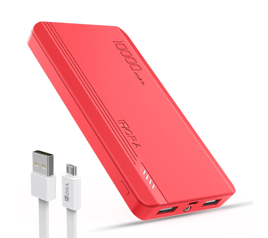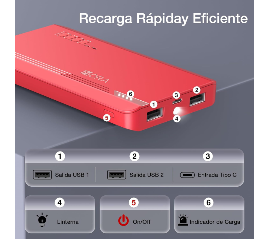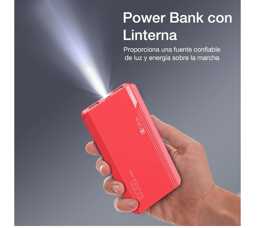 Batería Portatil 1HORA GAR140, 10,000mAh, 3 PUERTOS:1MICRO USB, 2USB-A + LINTERNA 10.5W Power Bank, Rojo