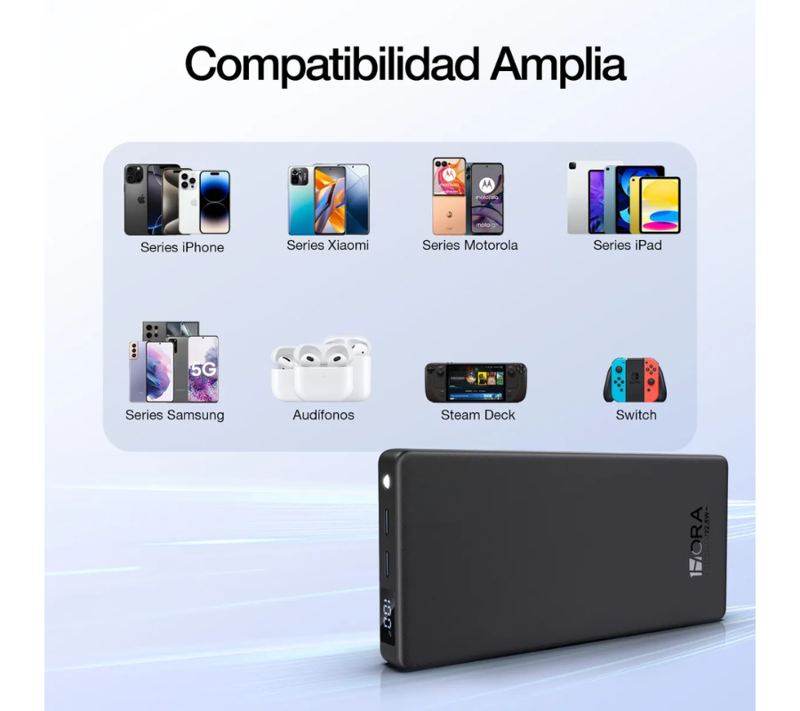 Carga rápida para iPhone, Huawei, Samsung y otros dispositivos digitales. Un solo powerbank para mantenerte conectado en cualquier parte del mundo.