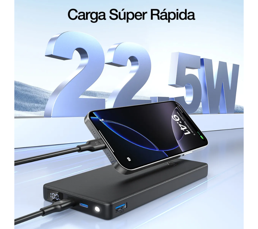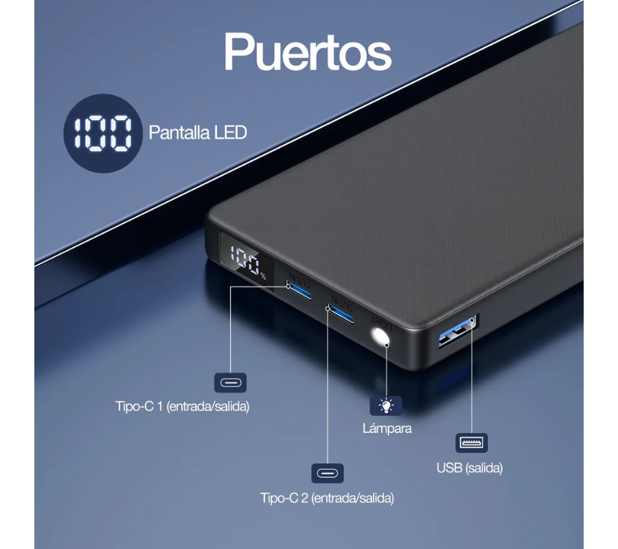 Powerbank 10000mAh con Puerto Dual Tipo-C & USB-A | Carga Rápida y Pantalla LED Inteligente. Ligero, potente y seguro. Compatible con PD3.0, QC3.0, SCP y más, este cargador portátil ofrece carga rápida para iPhone, Huawei, Samsung y otros dispositivos. Con pantalla LED que muestra el nivel exacto de batería, linterna integrada, protección múltiple y cable Tipo-C incluido.
