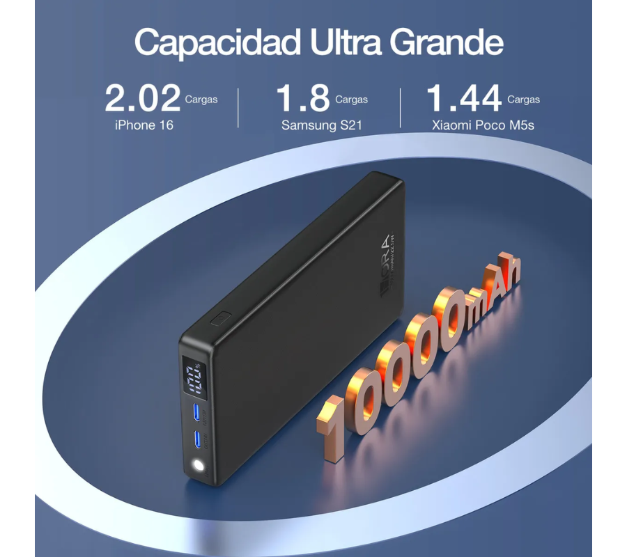 Con una batería de 10000mAh, tendrás carga suficiente para varias recargas diarias. Y con solo 235g, es más ligero que un teléfono, fácil de llevar en el bolsillo y perfecto para acompañarte a todas partes.
