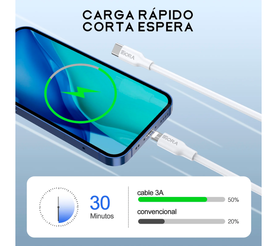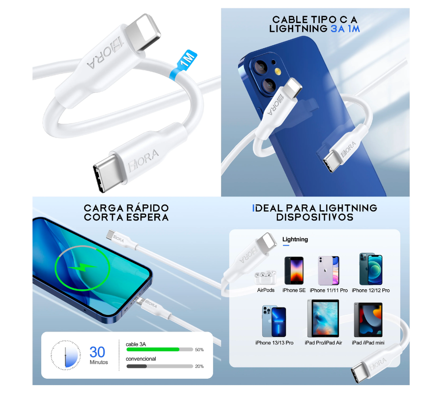 Cable Tipo C a Lightning 1HORA CAB258, 1M, 3A, Blanco