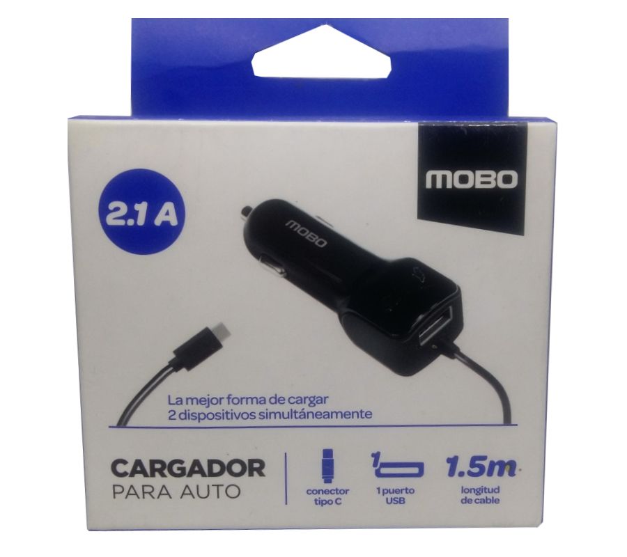 Cargador de Auto MOBO Tipo C+1 puerto USB 2.1A Negro 1.5M