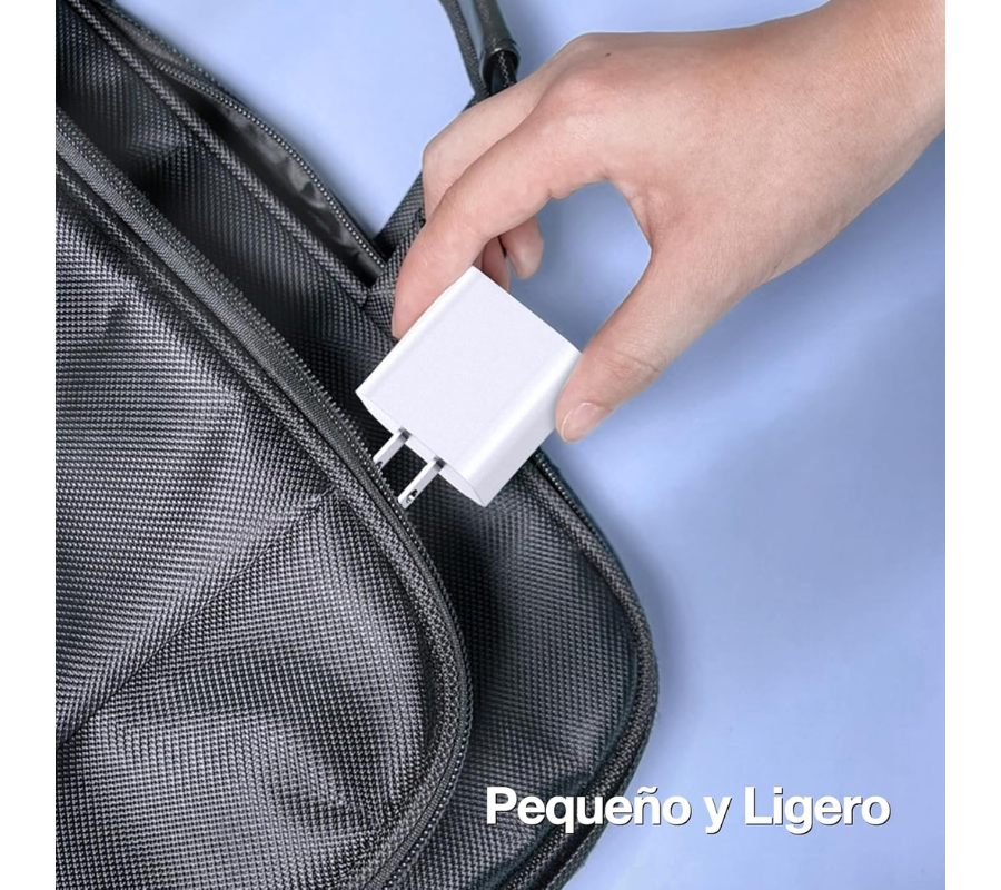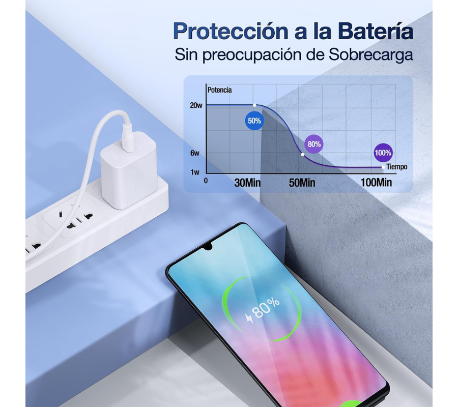 Con una potencia de salida máxima de 20 W, cargue rápidamente sus dispositivos. Solo se necesitan 30 minutos para cargar el celular del 0% al 50%. Incluye un cable de carga rápida Tipo c a Tipo c de 1 m. (NOTA: El cabezal de carga compatible para iPhone).