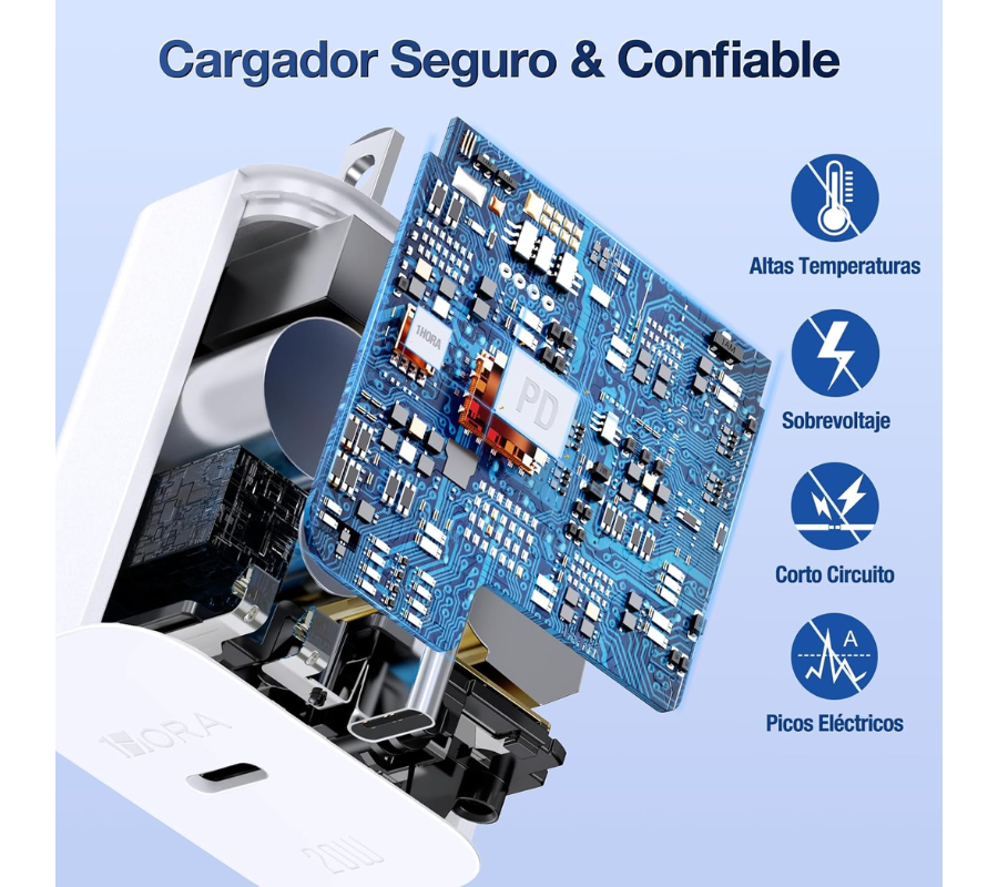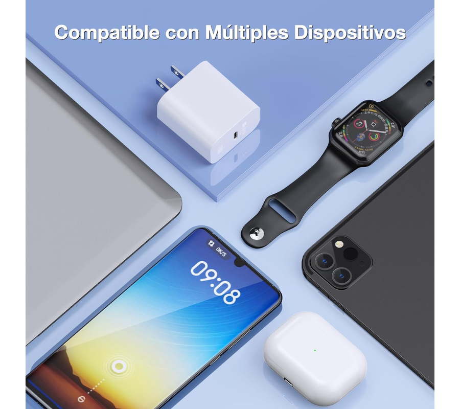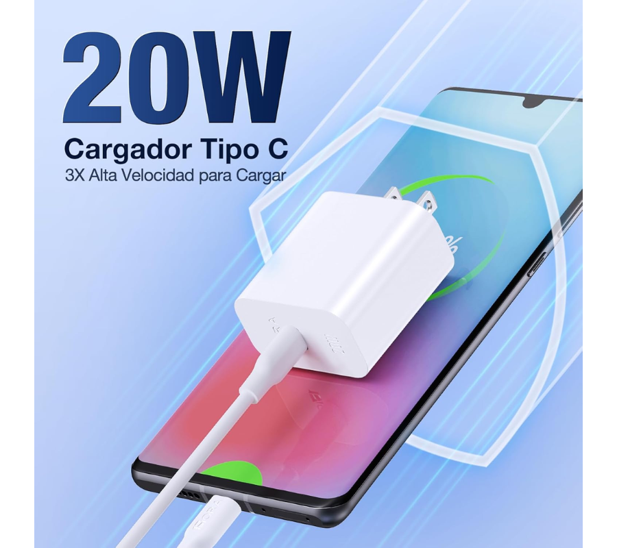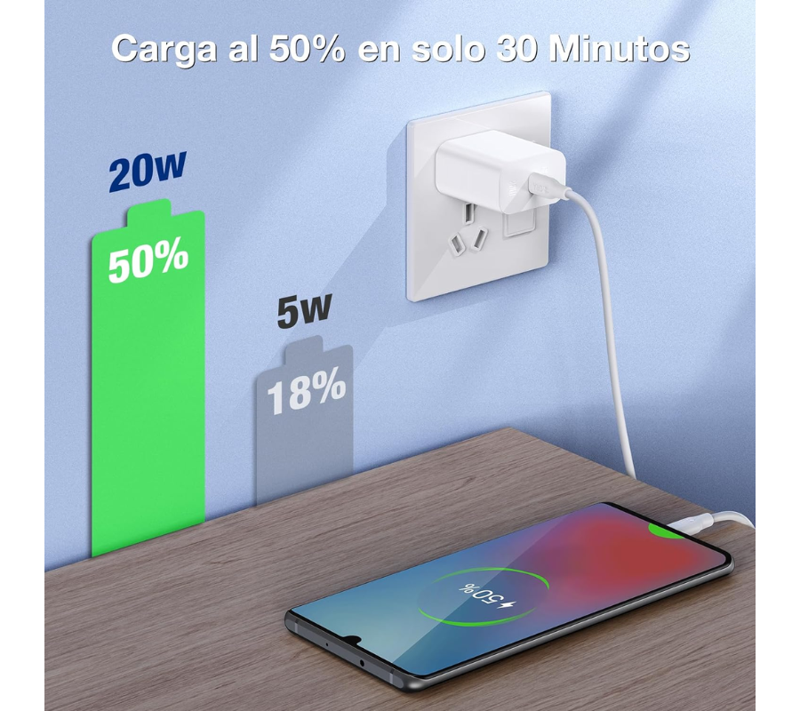Con una potencia de salida máxima de 20 W, cargue rápidamente sus dispositivos. Solo se necesitan 30 minutos para cargar el celular del 0% al 50%. Incluye un cable de carga rápida Tipo c a Tipo c de 1 m. (NOTA: El cabezal de carga compatible para iPhone).