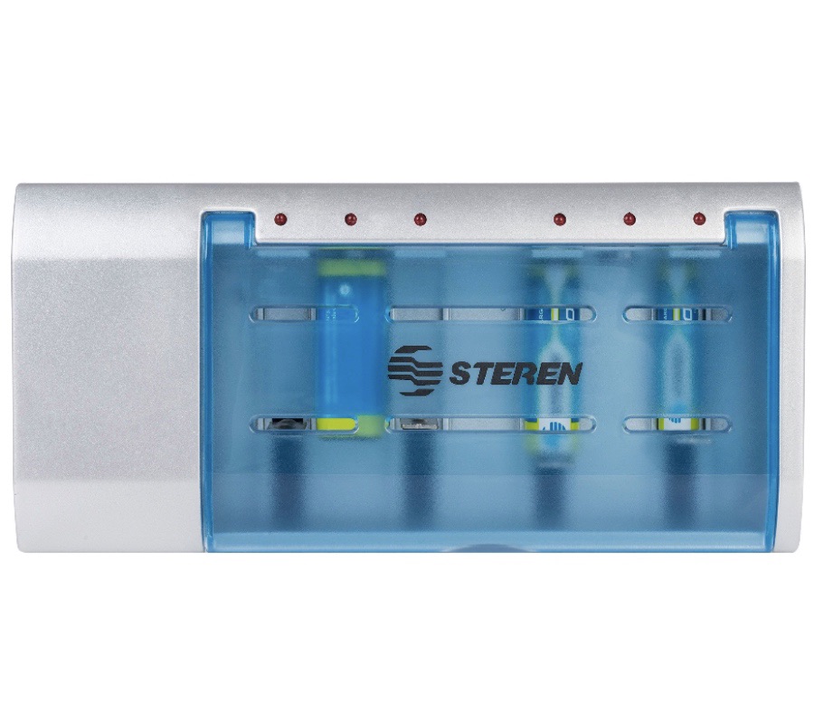 Es muy versátil ya que puede recargar pilas de forma independiente o varias al mismo tiempo. Cuenta con LEDs indicadores de carga que encienden en color rojo y tapa protectora.