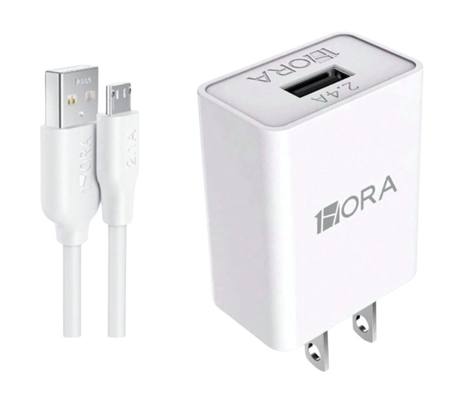Combo Cargador de Pared 1 puerto USB a V8 Micro USB 1HORA GAR124, 2.4A Cable + Cargador, Blanco