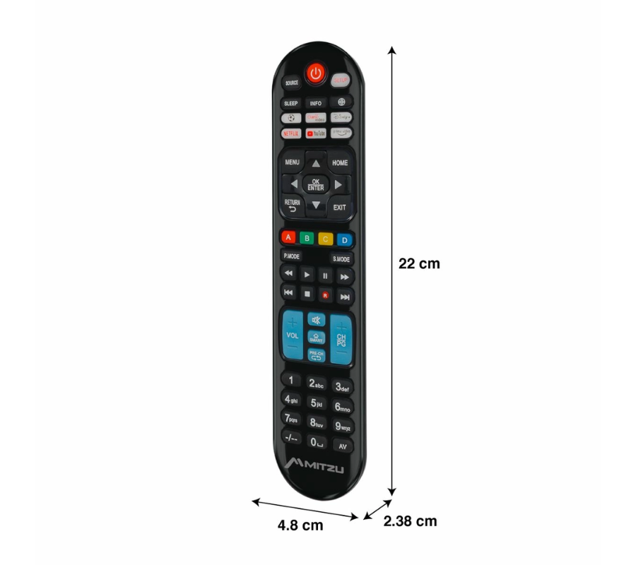 Su diseño ergonómico y funcional te permitirá acceder a todas las funciones de tu pantalla LED de manera intuitiva. Además, su marca Mitzu garantiza calidad y confiabilidad en cada uso. Este control remoto universal no incluye batería, por lo que podrás elegir la que mejor se adapte a tus necesidades.