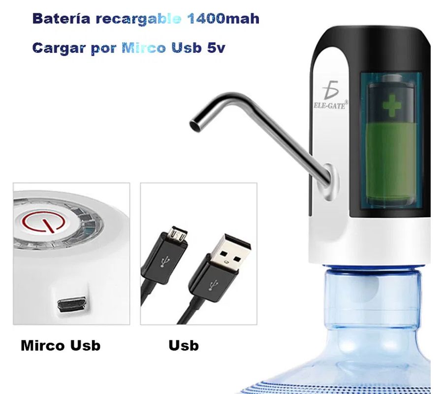 Conecta la manguera de silicona e inserta la manguera de silicona en la botella. Luego sujeta la bomba de agua. Pulsa el botón para despachar el agua, de nuevo para detener el bombeo Carga con el cable Micro USB cuando no hay batería.