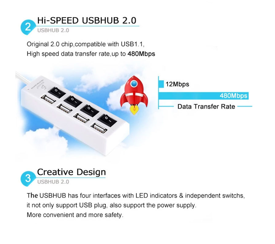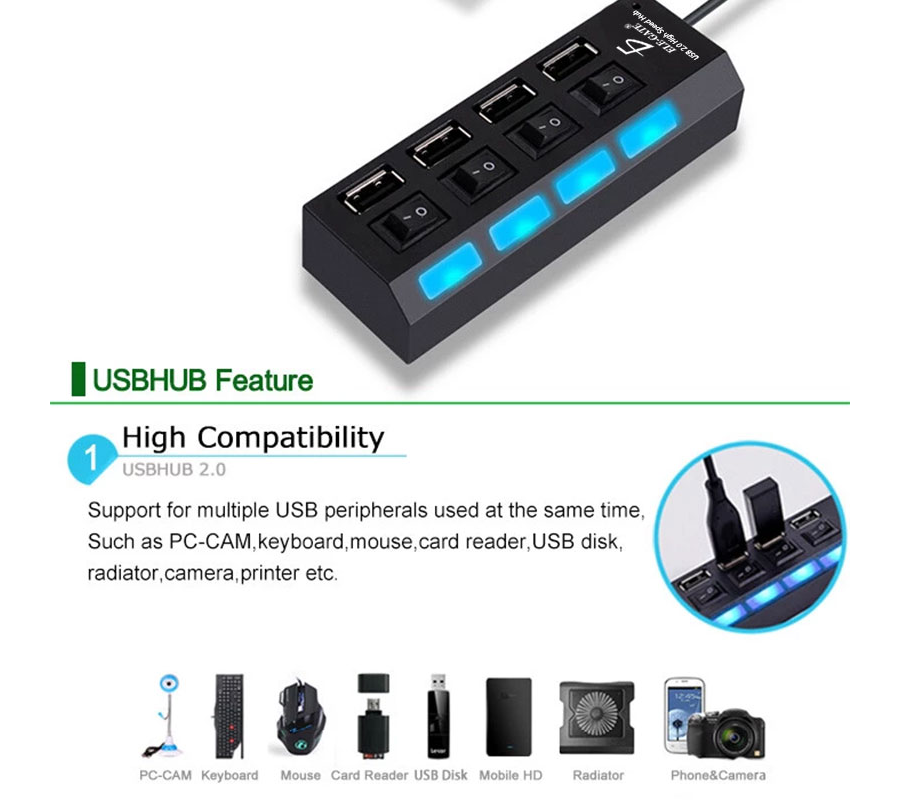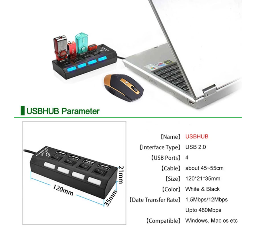 Hub Usb 2.0 4 Puertos Con Switchs Pc Laptop Windows Computadoras