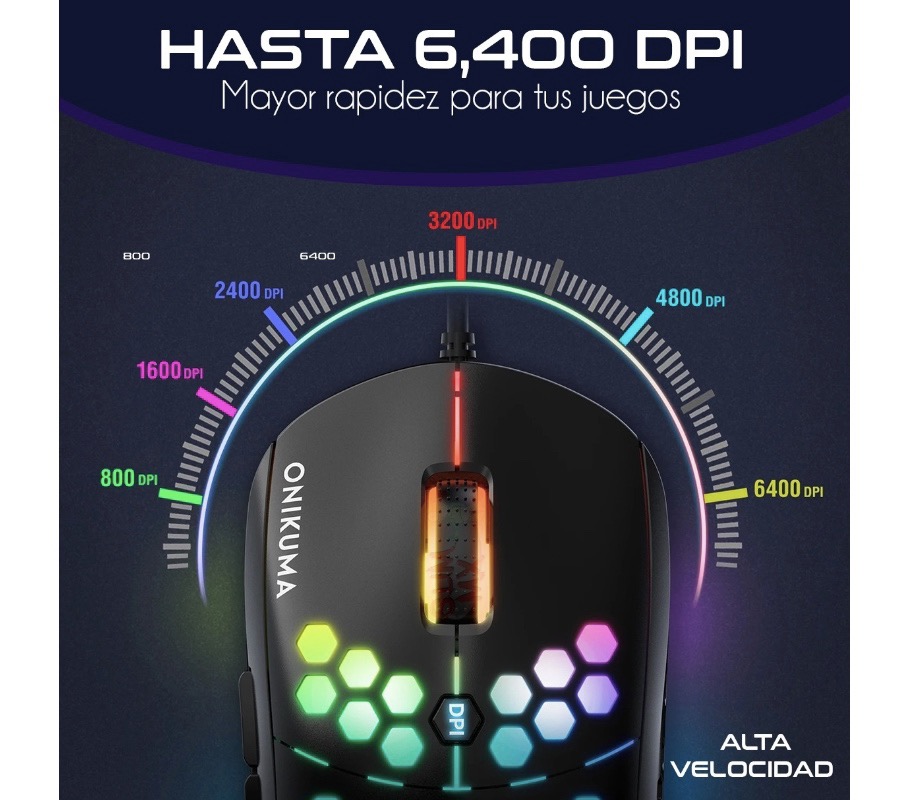 Nacido para verdaderos Jugadores Gamer de PC, está diseñado con 6 niveles de ajuste DPI (800/1600/2400/3200/4800/6400 DPI). Creado con 6 botones que se adaptan a tus necesidades, dándote una mayor presión en todas tus partidas y luces retroilumnadas RGB que le dará un toque único a tu área de juego.