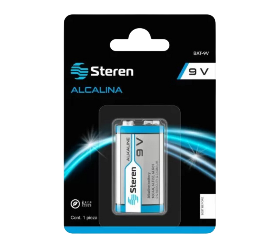 DESCRIPCIÓN: PILA ALCALINA TAMAÑO 9 VOLTS MARCA STEREN. VOLTAJE: 9 VCC.